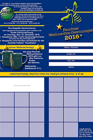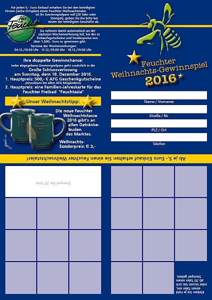 Das Feuchter Taler-Gewinnspiel der Einzelhändler und der Weihnachtsmarkt sorgten auch 2016 für ein gelungenes Ende eines ereignisreichen Jahres. Zur großen Freude der Budenbetreiber war der Markt an allen vier Wochenenden sehr gut besucht. Dazu veranstaltete der AFG am 1. Advent wieder einen verkaufsoffenen Sonntag. Spannender Höhepunkt des Marktes war die Ziehung der Gewinner beim Taler-Gewinnspiel. Wie immer gab es tolle Preise zu gewinnen.